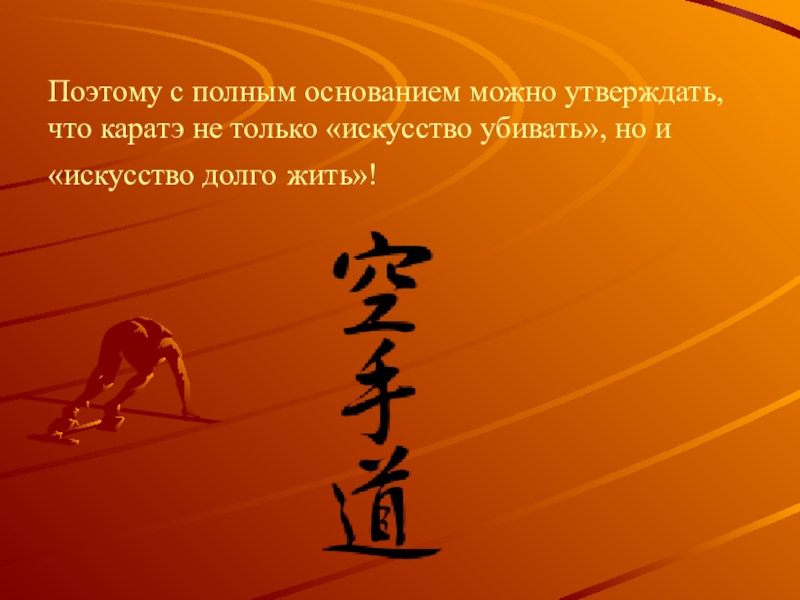 Слайд 15Поэтому с полным основанием можно утверждать, что каратэ не только «искусство убивать», но