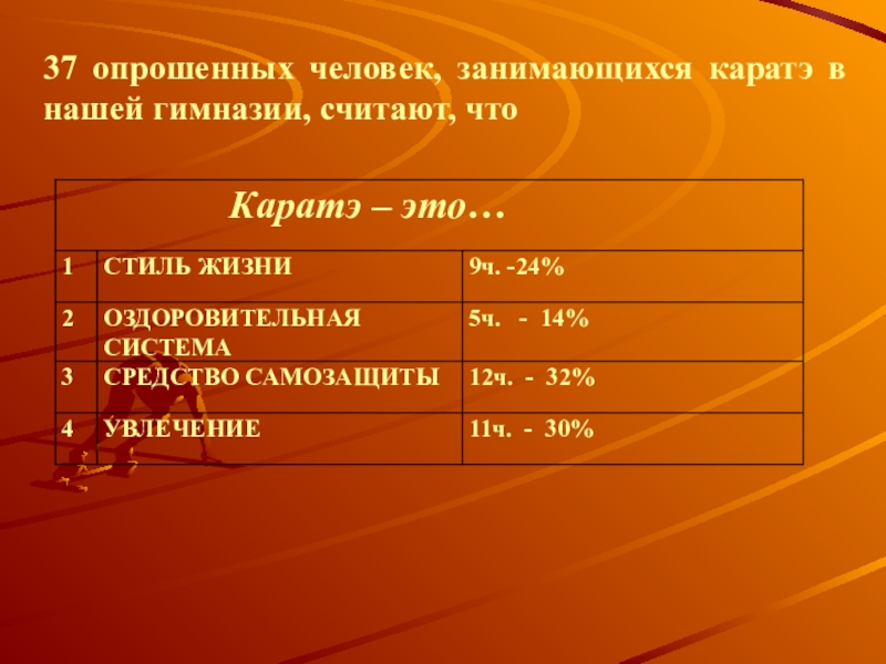 Слайд 737 опрошенных человек, занимающихся каратэ в нашей гимназии, считают, что