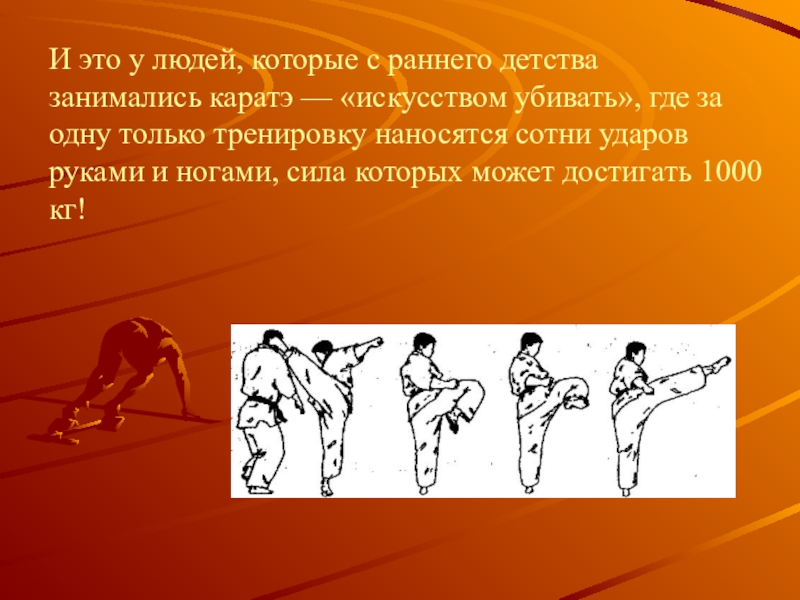 Слайд 12И это у людей, которые с раннего детства занимались каратэ — «искусством убивать»,
