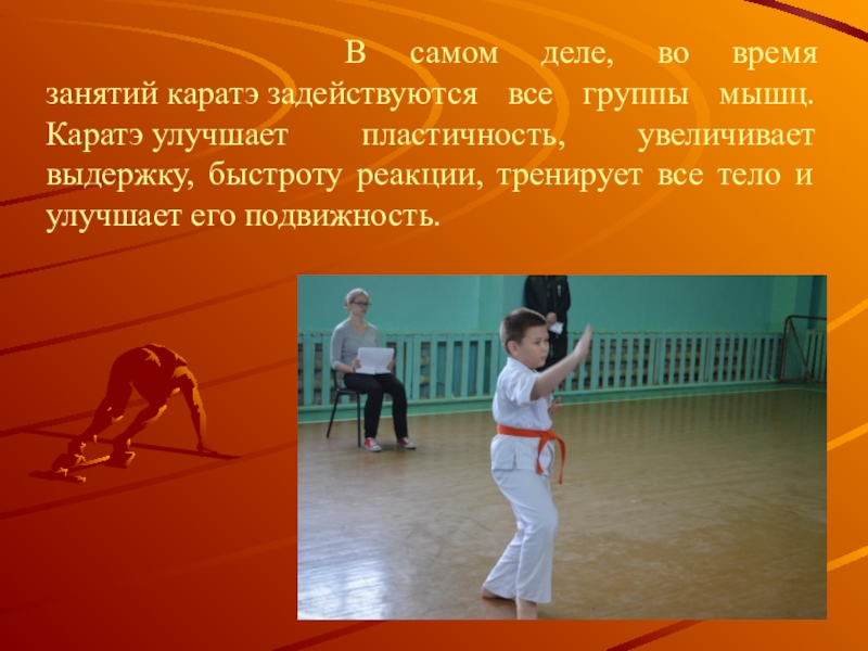 группы мышц. Каратэ улучшает пластичность, увеличивает выдержку, быстроту реакции, тренирует все тело и улучшает его подвижность.