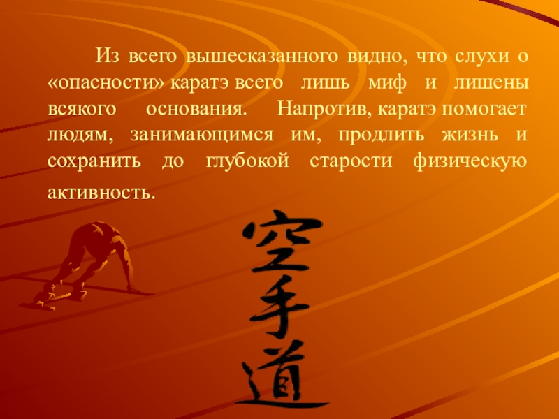 Слайд 14 Из всего вышесказанного видно, что слухи о «опасности» каратэ всего