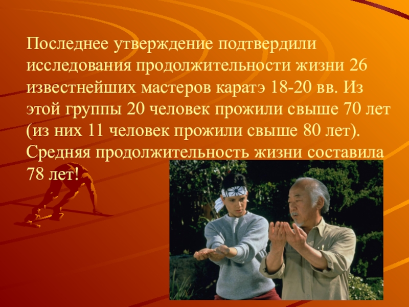 Слайд 11Последнее утверждение подтвердили исследования продолжительности жизни 26 известнейших мастеров каратэ 18-20 вв. Из