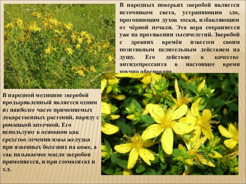 В народной медицине зверобой продырявленный является одним из наиболее часто применяемых лекарственных растений, наряду с ромашкой аптечной. Его используют в основном как средство лечения язвы желудка при язвенных болезнях на коже, а так называемое масло зверобоя применяется, и при стоматитах и т.д.