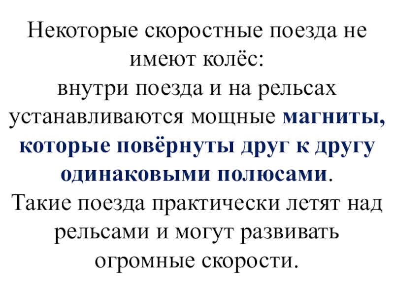 Некоторые скоростные поезда не имеют колёс: внутри поезда и на рельсах устанавливаются мощные магниты, которые повёрнуты друг