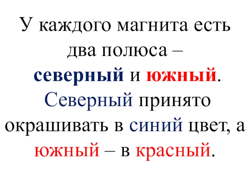 У каждого магнита есть два полюса – северный и южный. Северный принято окрашивать в синий цвет, а