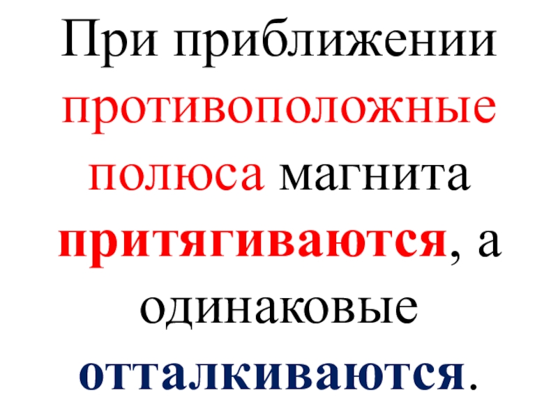 Слайд 30При приближении противоположные полюса магнита притягиваются, а одинаковые отталкиваются.