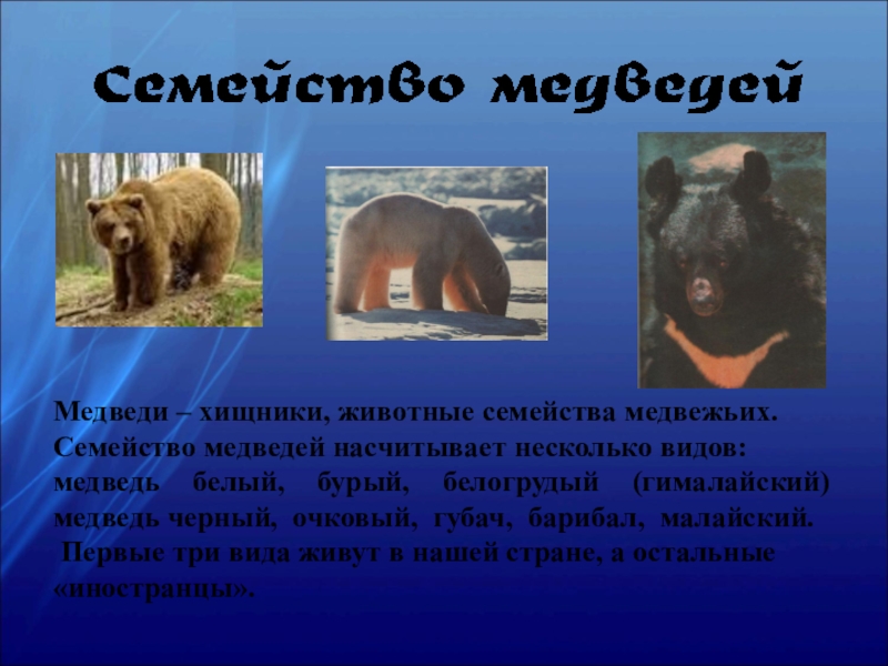 Слайд 8Медведи – хищники, животные семейства медвежьих.