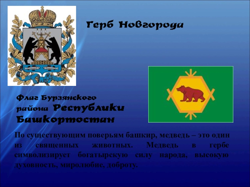 Медведь в гербе символизирует богатырскую силу народа, высокую духовность, миролюбие, доброту.