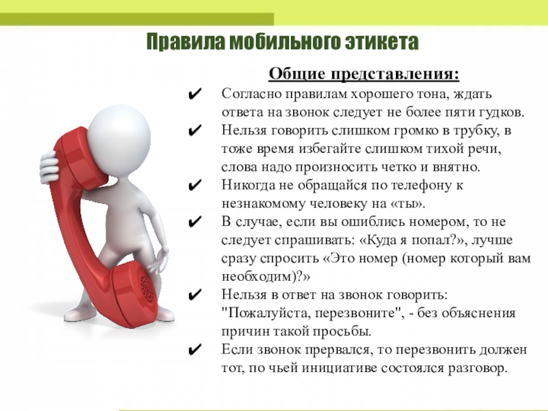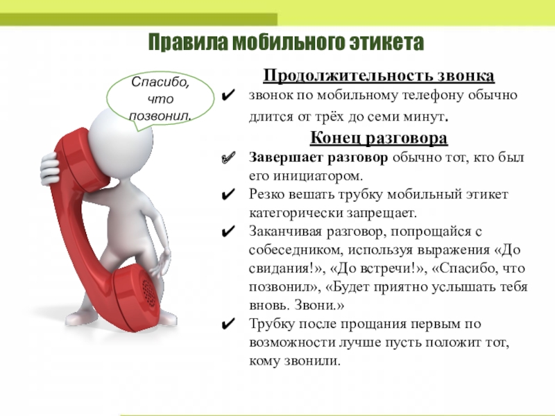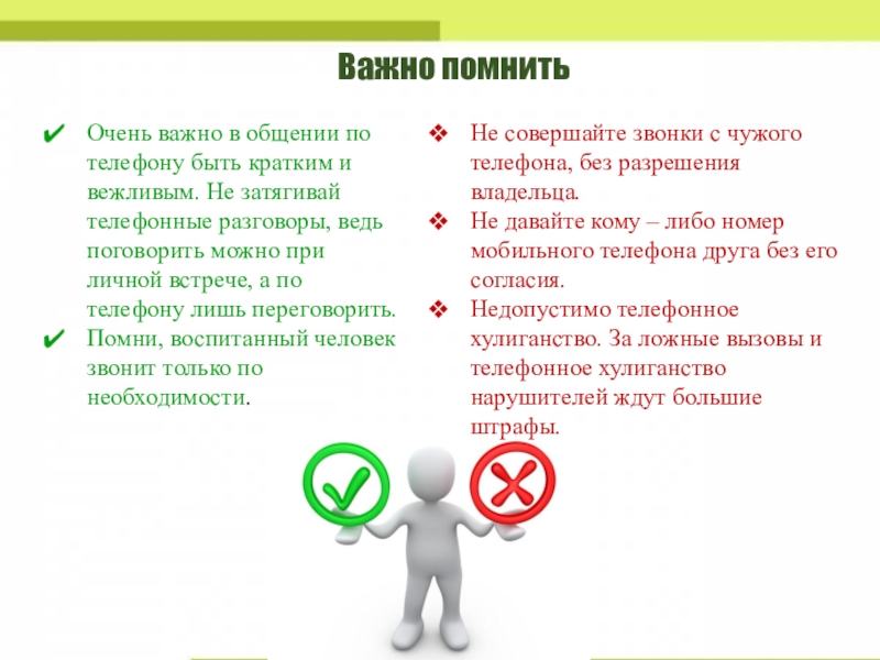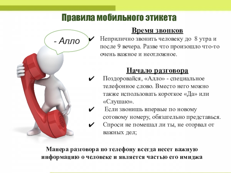 Очень важно в общении по телефону быть кратким и вежливым. Не затягивай телефонные разговоры, ведь поговорить можно при личной встрече, а по телефону лишь переговорить.