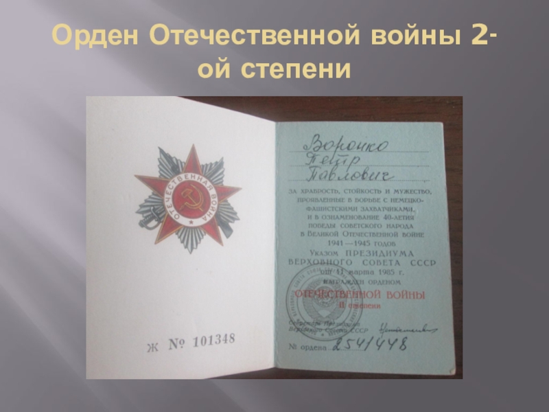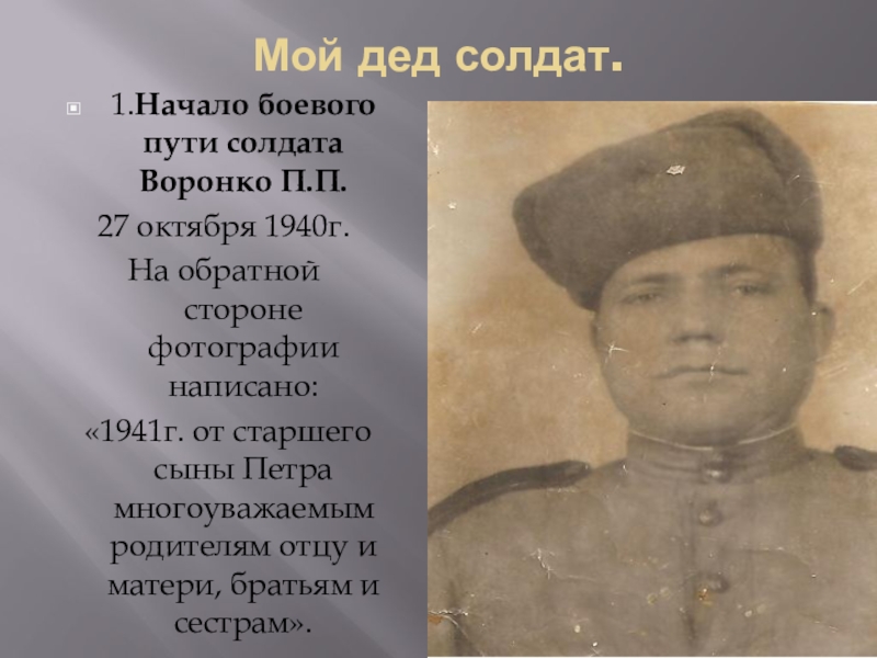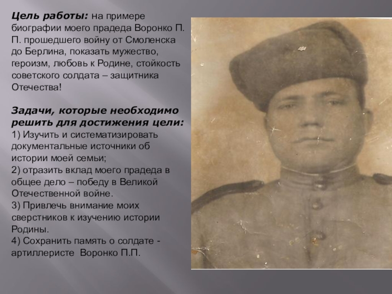 Слайд 4Цель работы: на примере биографии моего прадеда Воронко П.П. прошедшего войну