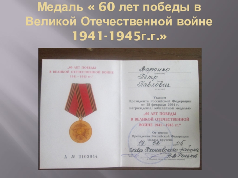 Слайд 18Медаль « 60 лет победы в Великой Отечественной войне 1941-1945г.г.»