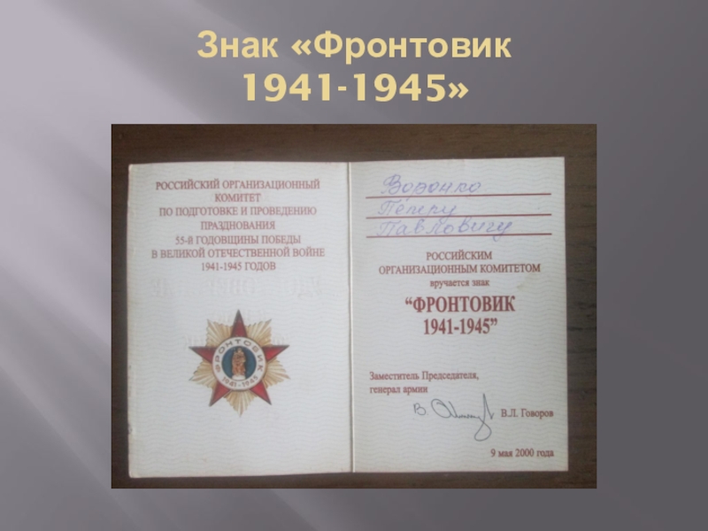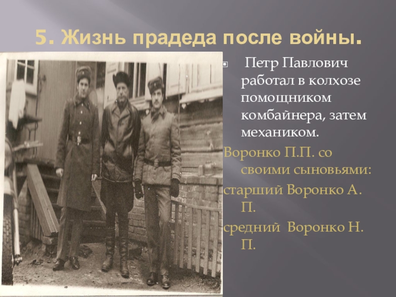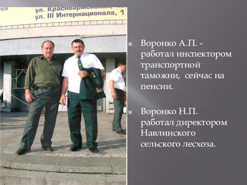 Слайд 20Воронко А.П. - работал инспектором транспортной таможни, сейчас на пенсии.