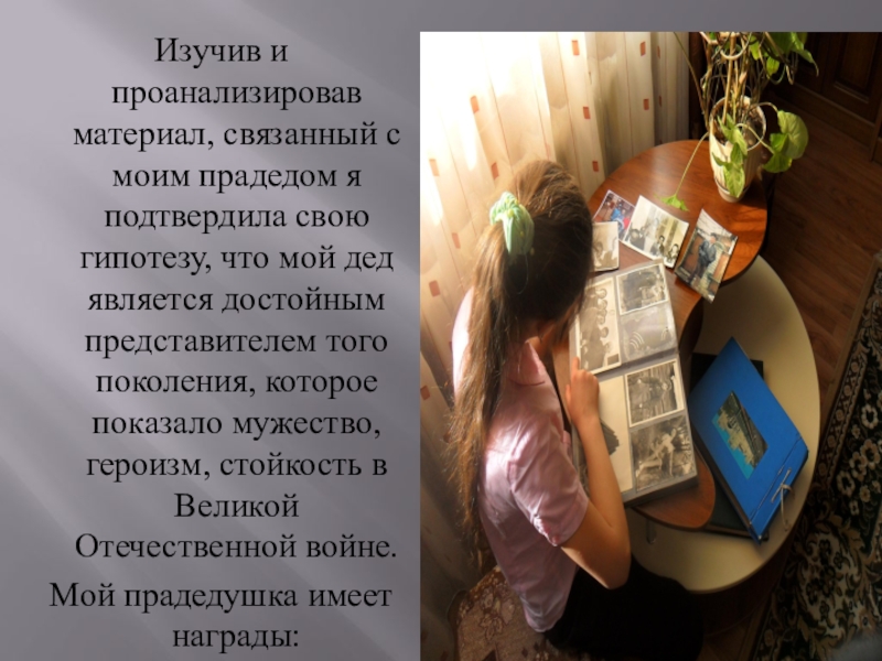 Слайд 14 Изучив и проанализировав материал, связанный с моим прадедом я подтвердила