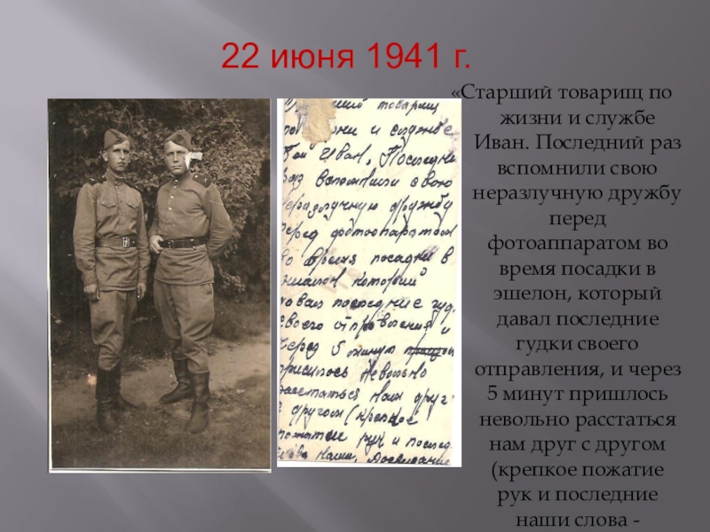 раз вспомнили свою неразлучную дружбу перед фотоаппаратом во время посадки в эшелон, который давал последние гудки своего отправления, и через 5 минут пришлось невольно расстаться нам друг с другом (крепкое пожатие рук и последние наши слова - досвидания).