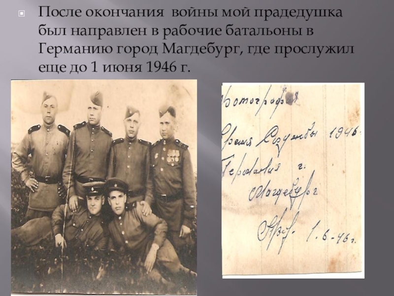 Слайд 12После окончания войны мой прадедушка был направлен в рабочие батальоны в