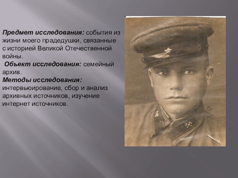 Слайд 5Предмет исследования: события из жизни моего прадедушки, связанные с историей Великой