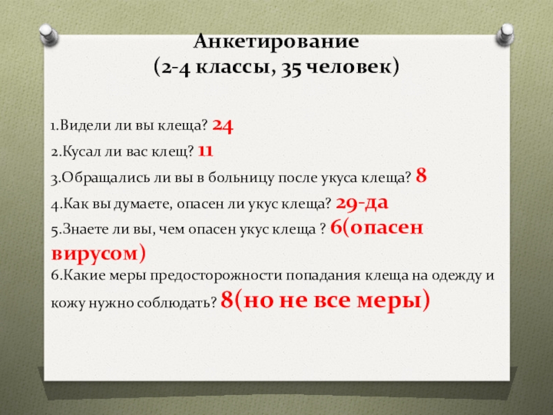 Анкетирование(2-4 классы, 35 человек)1.Видели ли вы клеща? 242.Кусал ли вас клещ? 113.Обращались ли вы в больницу после