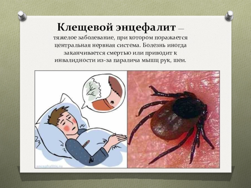 Слайд 7Клещевой энцефалит — тяжелое заболевание, при котором поражается центральная нервная система.