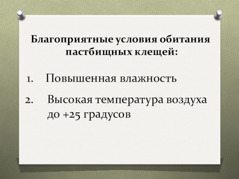 Благоприятные условия обитания пастбищных клещей:  Повышенная влажностьВысокая температура воздуха до +25 градусов