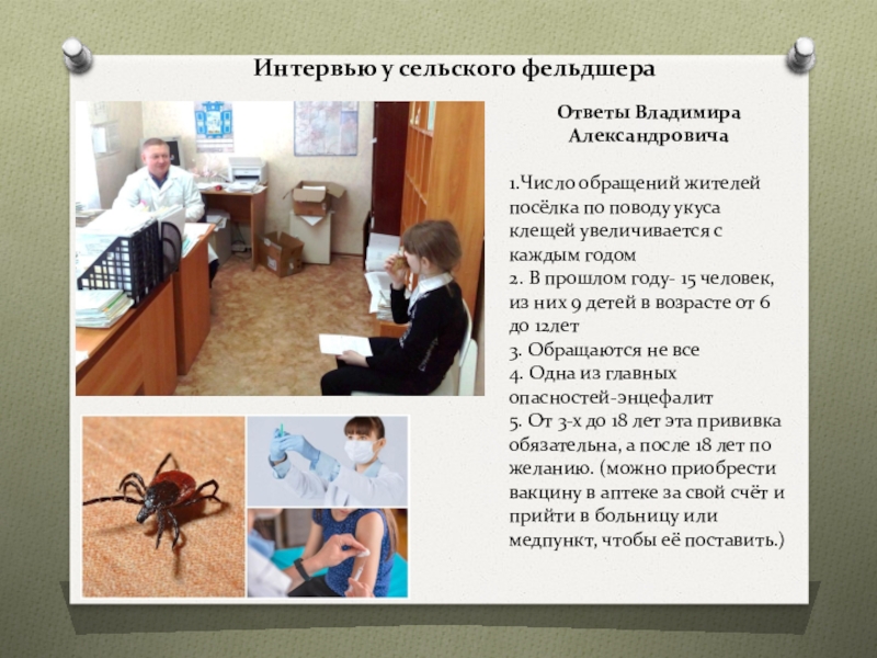 Интервью у сельского фельдшераОтветы Владимира Александровича1.Число обращений жителей посёлка по поводу укуса клещей увеличивается с каждым годом2.