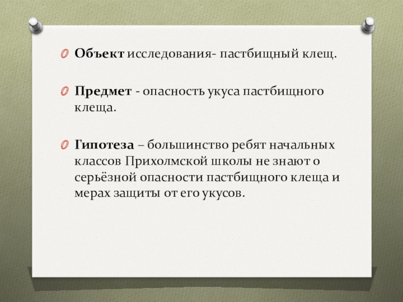 Объект исследования- пастбищный клещ. Предмет - опасность укуса пастбищного клеща. Гипотеза – большинство ребят начальных классов Прихолмской школы не знают о серьёзной опасности пастбищного клеща и мерах защиты от его укусов.