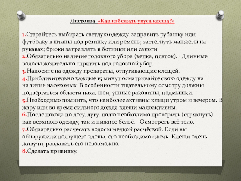 Слайд 12Листовка «Как избежать укуса клеща?»