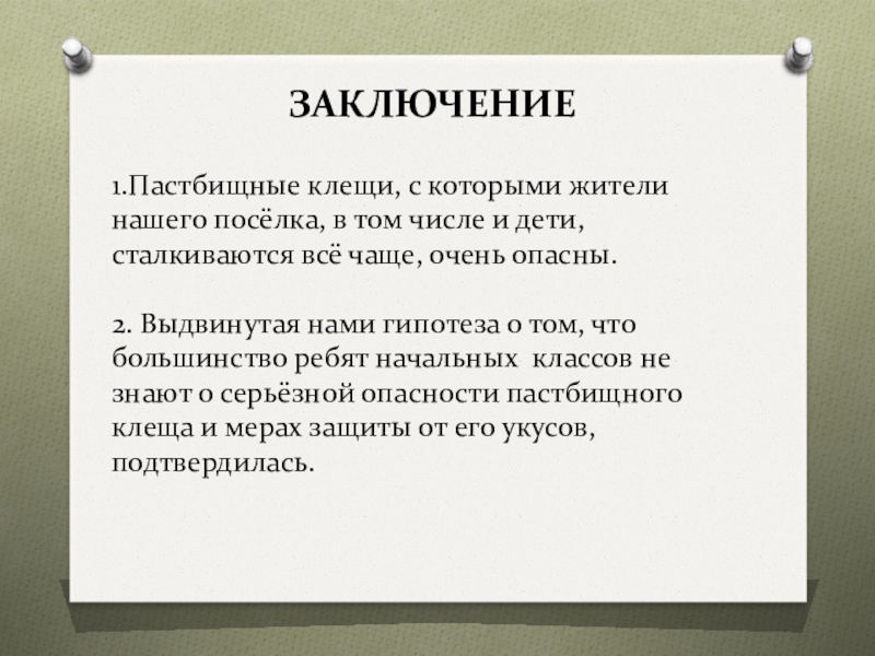 ЗАКЛЮЧЕНИЕ1.Пастбищные клещи, с которыми жители нашего посёлка, в том числе и дети, сталкиваются всё чаще, очень опасны.