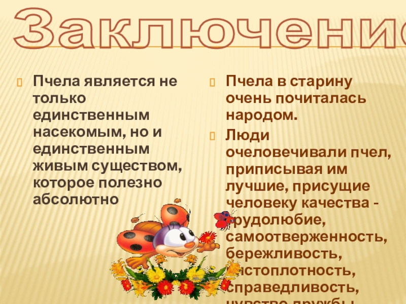 Люди очеловечивали пчел, приписывая им лучшие, присущие человеку качества - трудолюбие, самоотверженность, бережливость, чистоплотность, справедливость, чувство дружбы