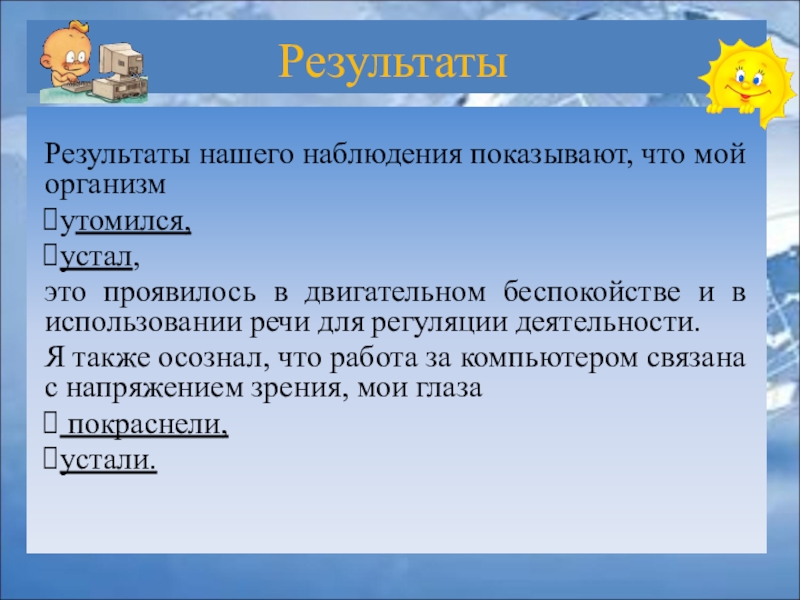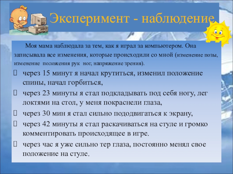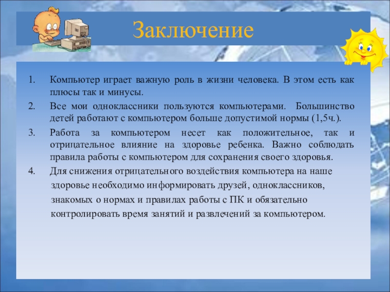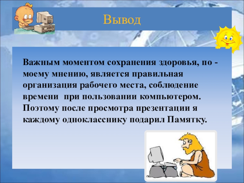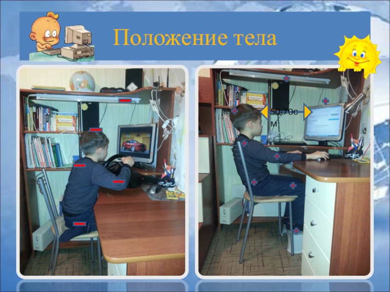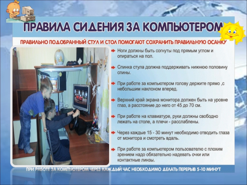 компьютером спину необходимо держать прямо напротив экрана, так, чтобы верхняя часть экрана находилась на уровне глаз. Ни в коем случае нельзя работать за компьютером лежа. Ноги должны быть согнуты под углом чуть больше 90 градусов, ступни располагаться на полу или специальной подставке. Плечи должны быть расправлены. Руки должны быть согнуты в локтях чуть больше, чем на 90 градусов. Клавиатура и мышь должны располагаться на уровне чуть ниже локтей.