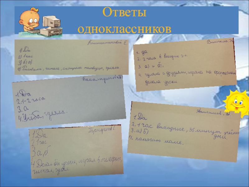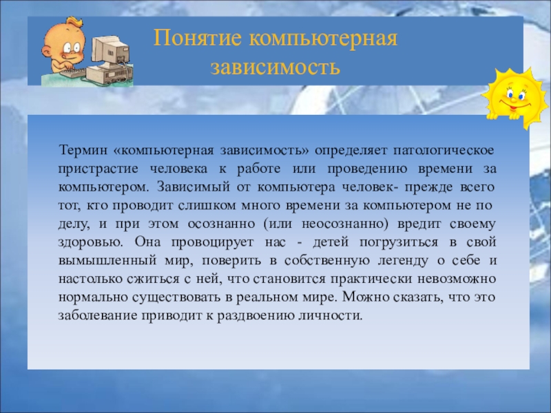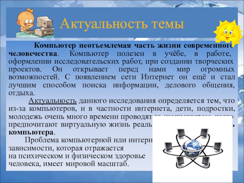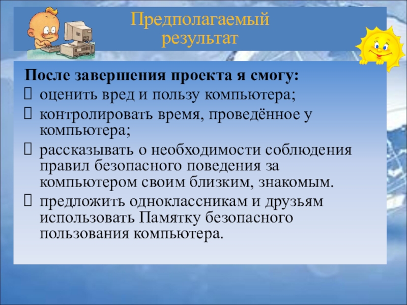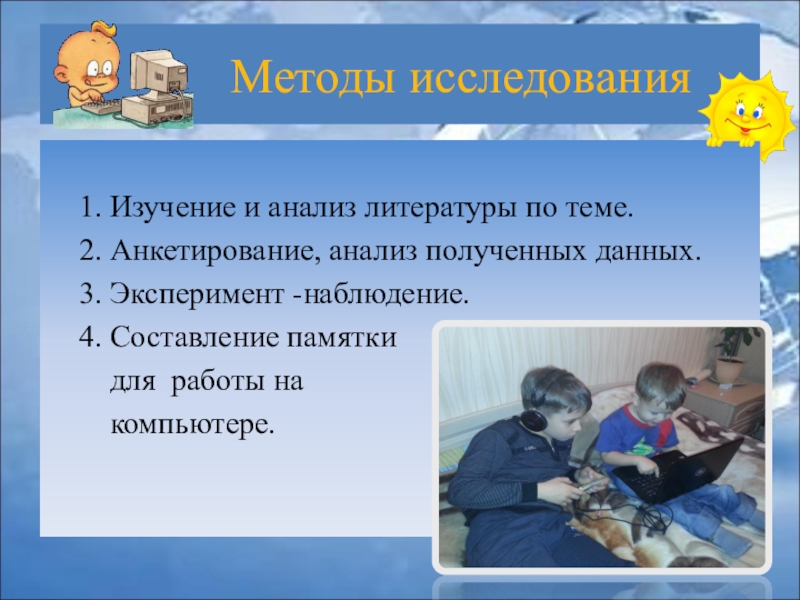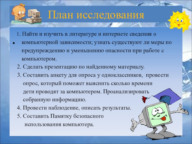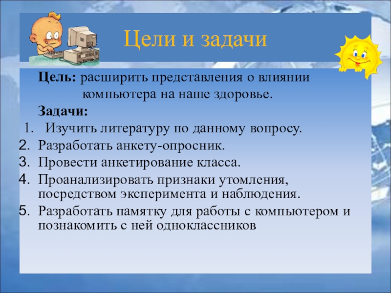 компьютером спину необходимо держать прямо напротив экрана, так, чтобы верхняя часть экрана находилась на уровне глаз. Ни в коем случае нельзя работать за компьютером лежа. Ноги должны быть согнуты под углом чуть больше 90 градусов, ступни располагаться на полу или специальной подставке. Плечи должны быть расправлены. Руки должны быть согнуты в локтях чуть больше, чем на 90 градусов. Клавиатура и мышь должны располагаться на уровне чуть ниже локтей.