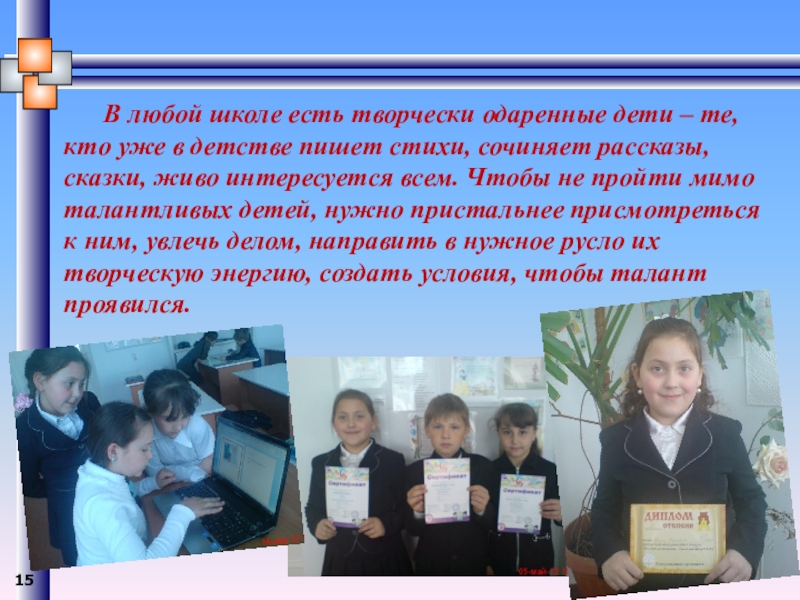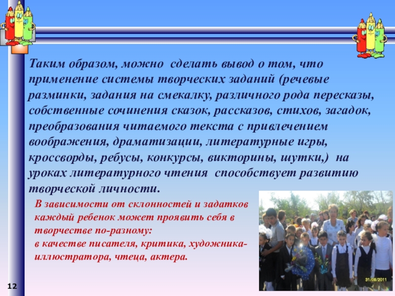 В зависимости от склонностей и задатков каждый ребенок может проявить себя в творчестве по-разному:
