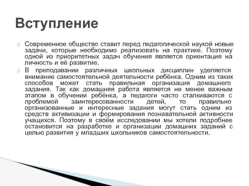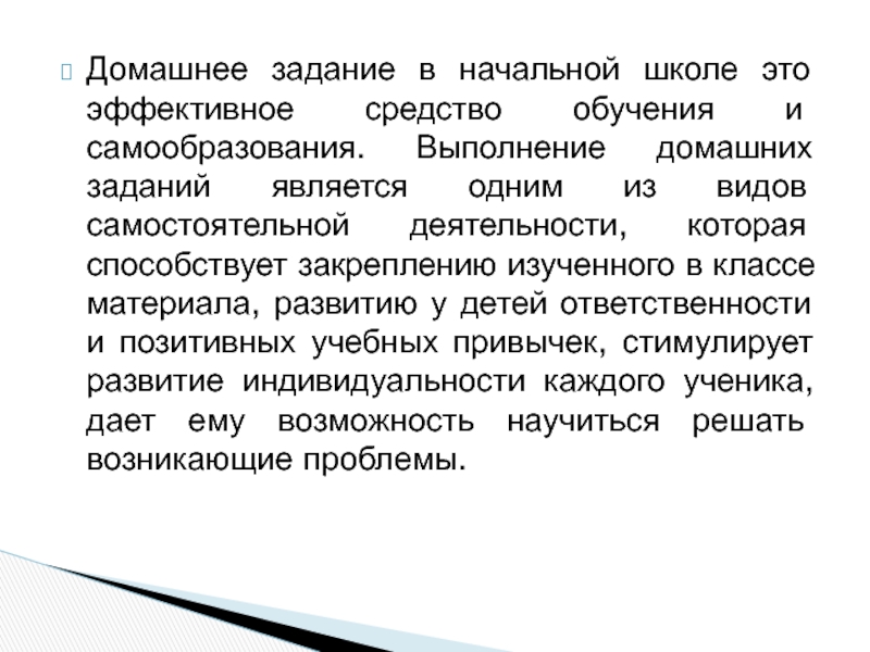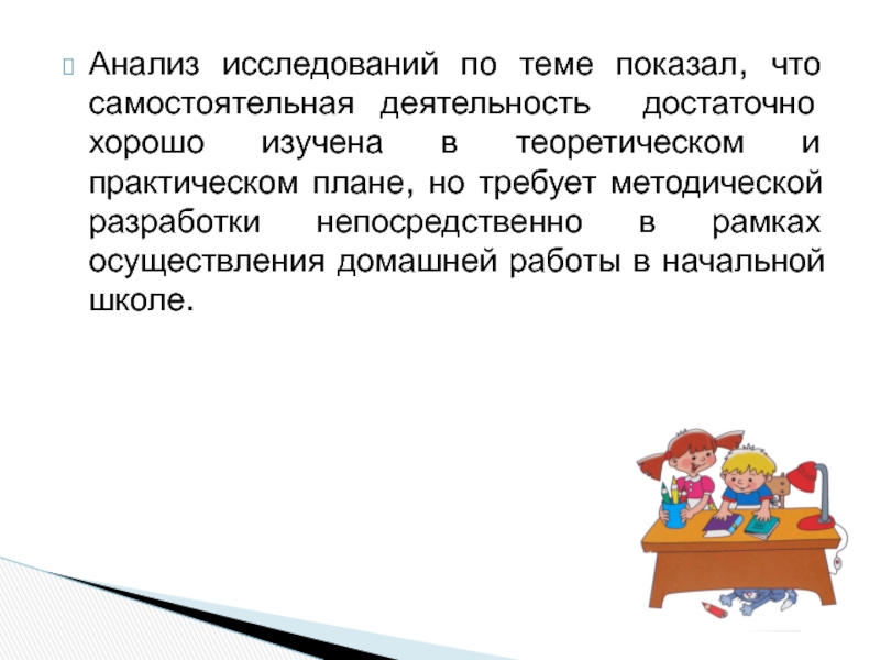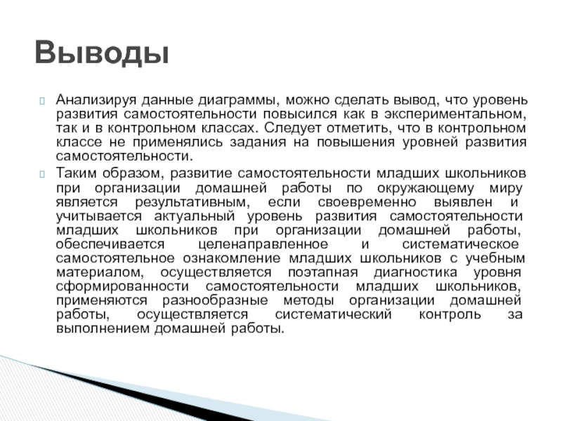 Таким образом, развитие самостоятельности младших школьников при организации домашней работы по окружающему миру является результативным, если своевременно выявлен и учитывается актуальный уровень развития самостоятельности младших школьников при организации домашней работы, обеспечивается целенаправленное и систематическое самостоятельное ознакомление младших школьников с учебным материалом, осуществляется поэтапная диагностика уровня сформированности самостоятельности младших школьников, применяются разнообразные методы организации домашней работы, осуществляется систематический контроль за выполнением домашней работы.