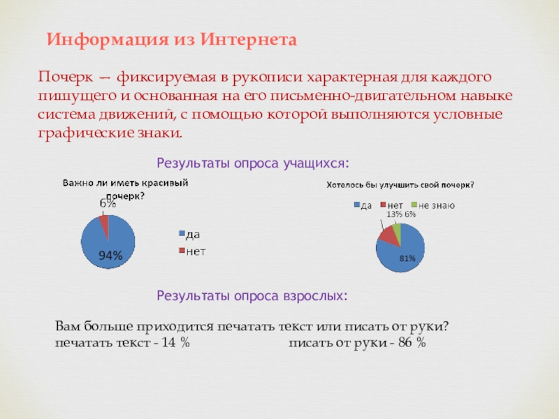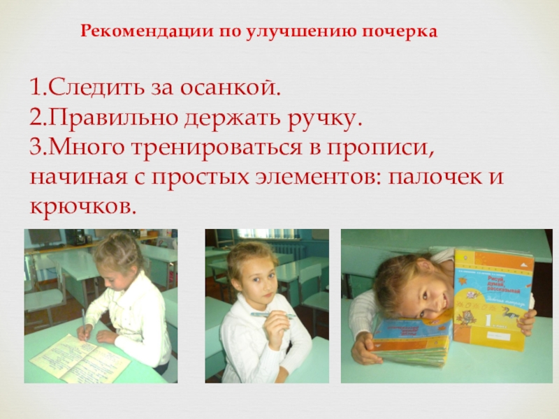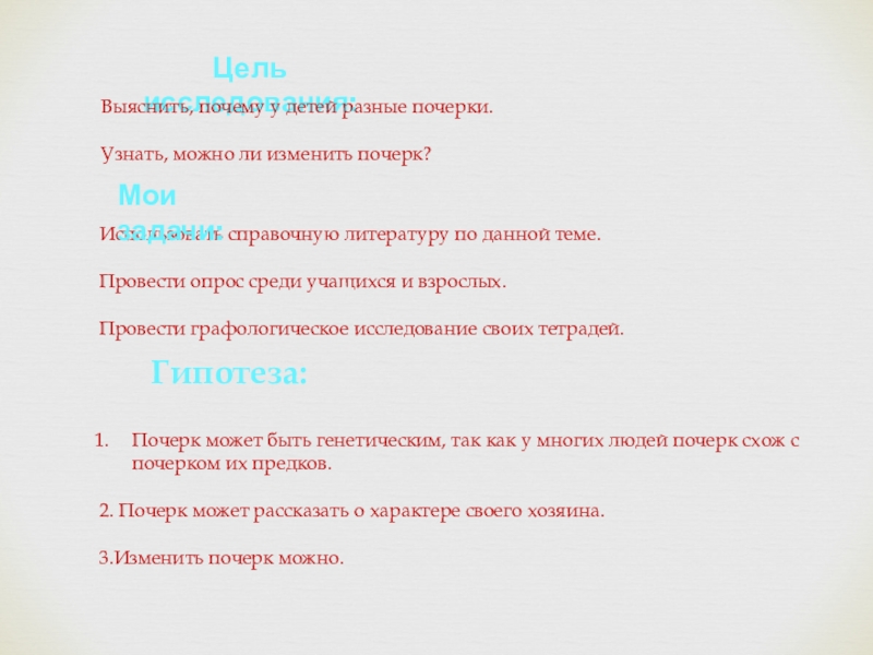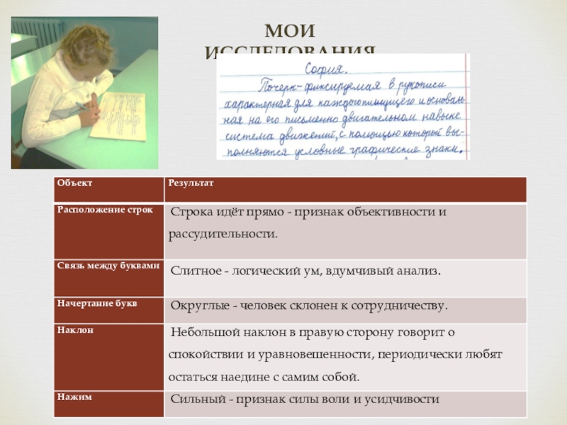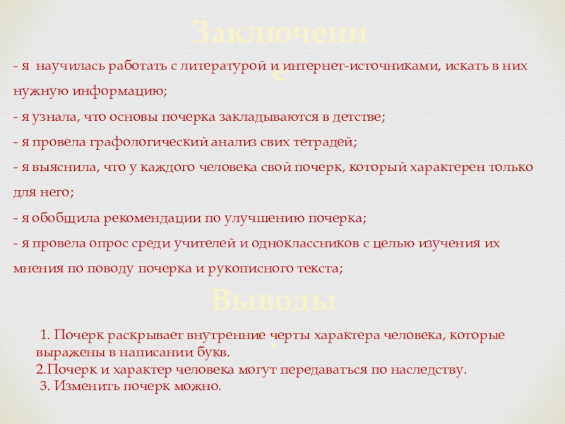 - я научилась работать с литературой и интернет-источниками, искать в них нужную информацию; - я узнала, что основы почерка закладываются в детстве; - я провела графологический анализ свих тетрадей; - я выяснила, что у каждого человека свой почерк, который характерен только для него; - я обобщила рекомендации по улучшению почерка; - я провела опрос среди учителей и одноклассников с целью изучения их мнения по поводу почерка и рукописного текста;