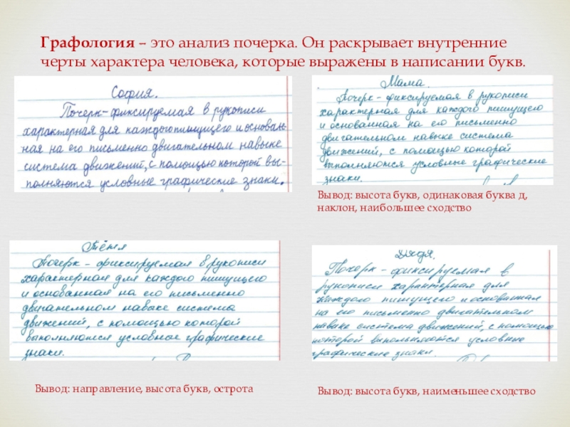 Вывод: высота букв, одинаковая буква д, наклон, наибольшее сходство