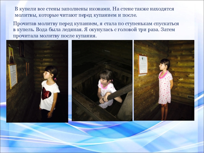 Прочитав молитву перед купанием, я стала по ступенькам спускаться в купель. Вода была ледяная. Я окунулась с головой три раза. Затем прочитала молитву после купания.