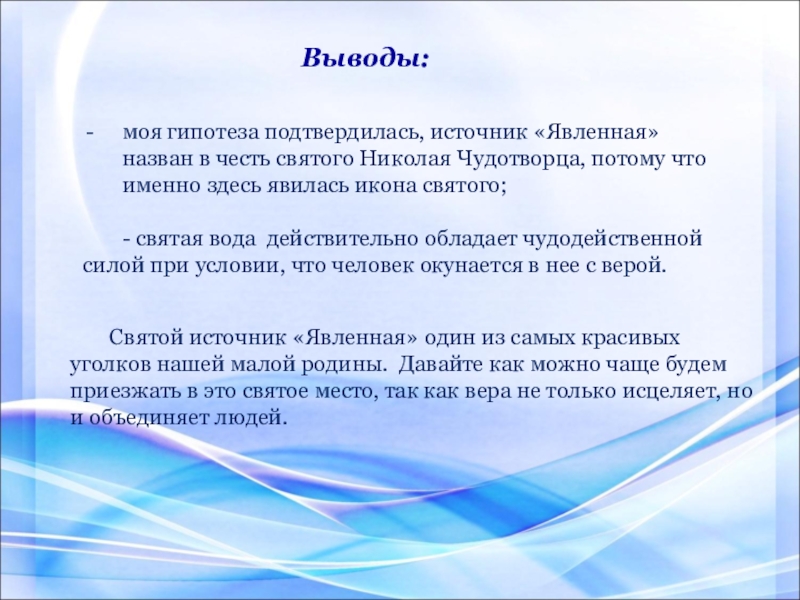 Святой источник «Явленная» один из самых красивых уголков нашей малой родины. Давайте как можно чаще будем приезжать в это святое место, так как вера не только исцеляет, но и объединяет людей.