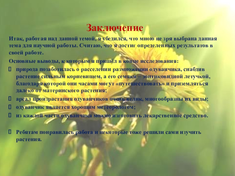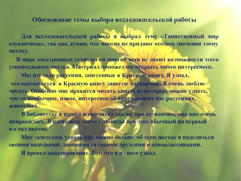 4. Узнать интересные факты о таинственном цветке одуванчике.