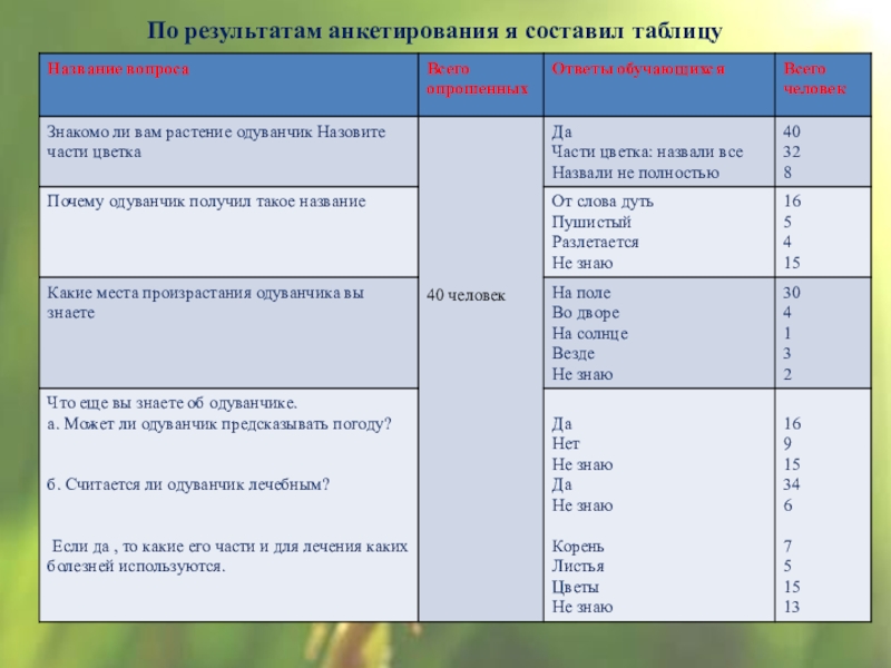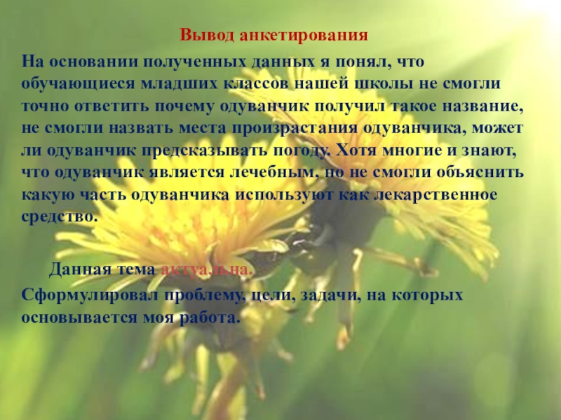 нашей школы не смогли точно ответить почему одуванчик получил такое название, не смогли назвать места произрастания одуванчика, может ли одуванчик предсказывать погоду. Хотя многие и знают, что одуванчик является лечебным, но не смогли объяснить какую часть одуванчика используют как лекарственное средство.