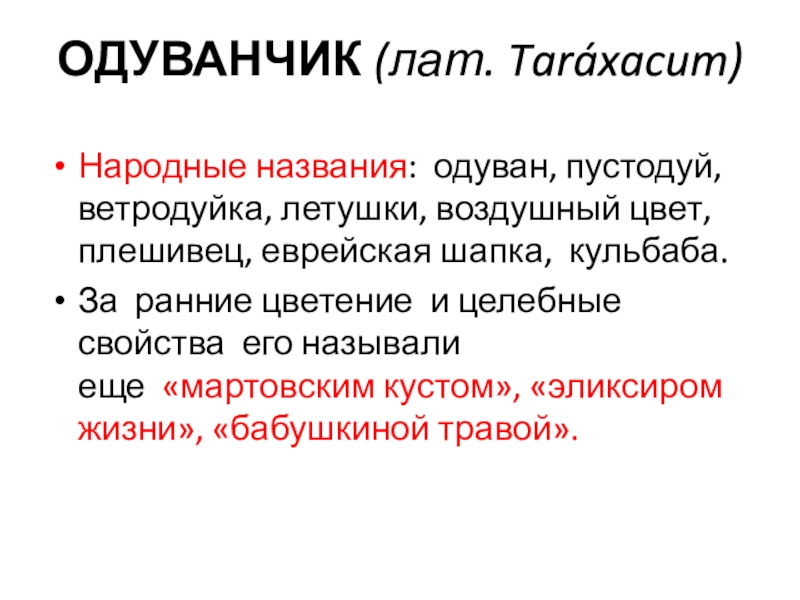 Народные названия: одуван, пустодуй, ветродуйка, летушки, воздушный цвет, плешивец, еврейская