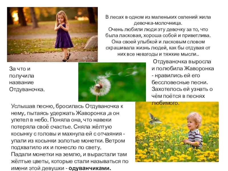 Падали монетки на землю, и вырастали там жёлтые цветы, которые стали называться по имени этой девушки - одуванчиками.