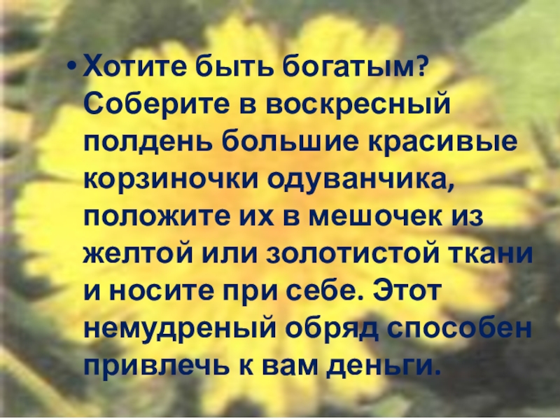 Слайд 38Хотите быть богатым? Соберите в воскресный полдень большие красивые корзиночки одуванчика,
