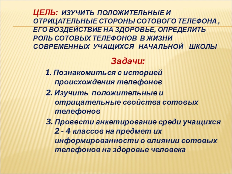 3. Провести анкетирование среди учащихся 2 - 4 классов на предмет их информированности о влиянии сотовых телефонов на здоровье человека