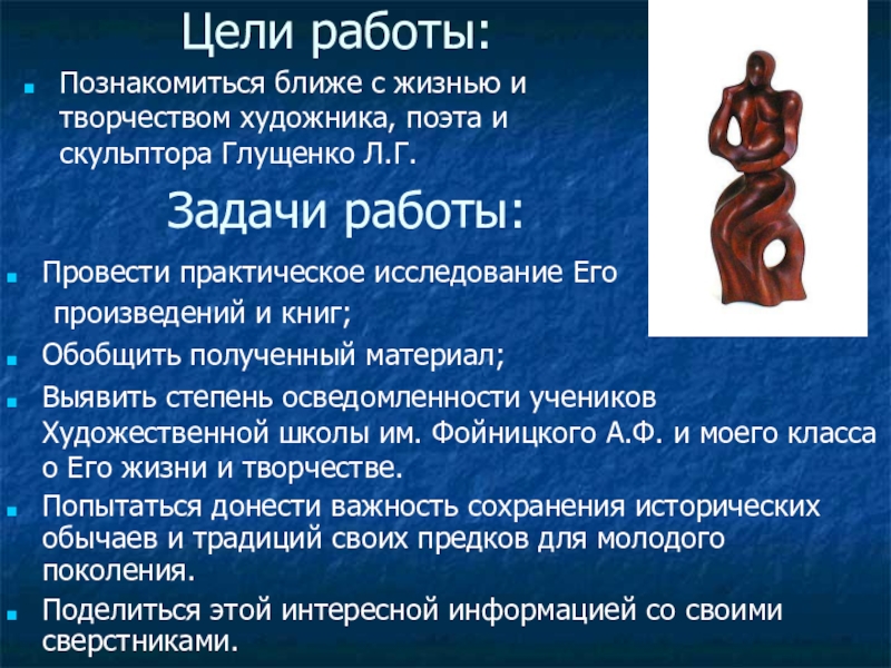 Выявить степень осведомленности учеников Художественной школы им. Фойницкого А.Ф. и моего класса о Его жизни и творчестве.