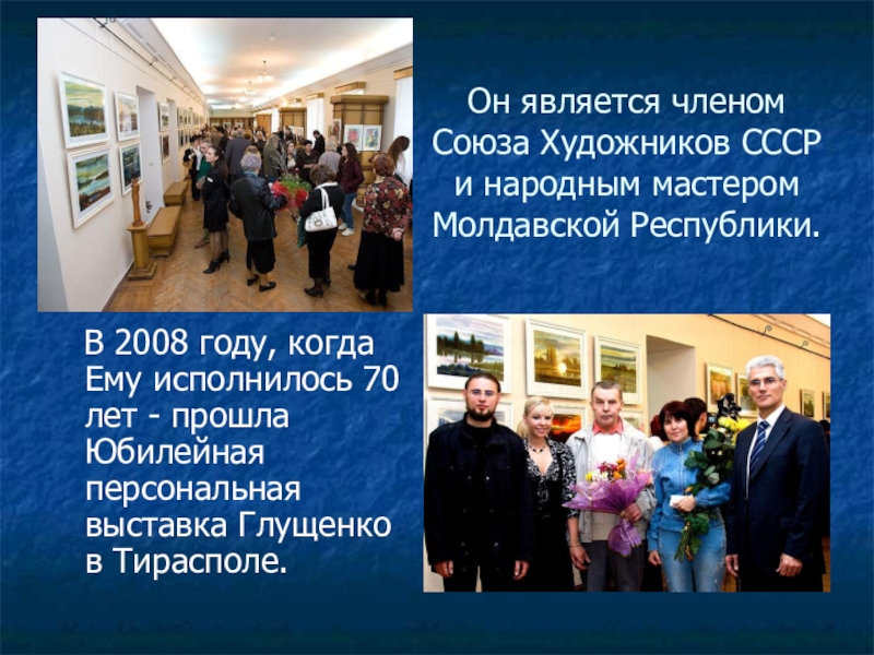 В 2008 году, когда Ему исполнилось 70 лет - прошла Юбилейная персональная выставка Глущенко в Тирасполе.