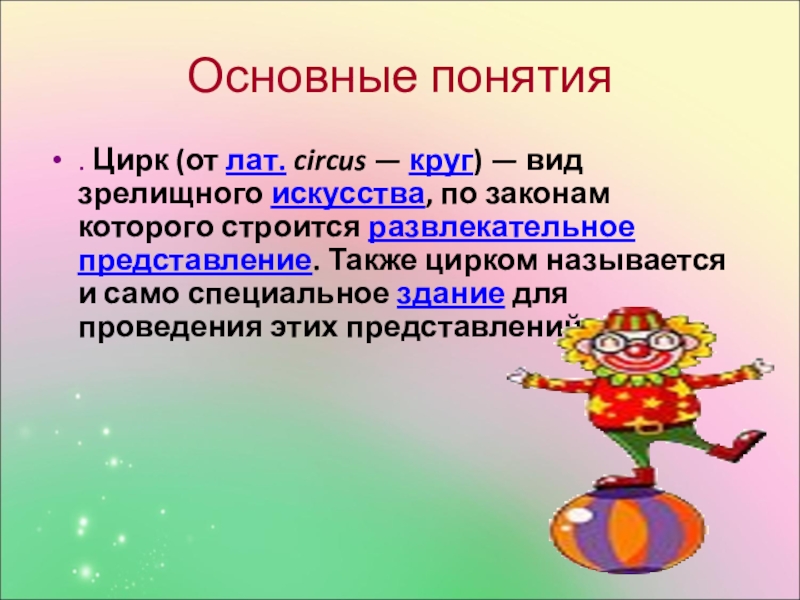 Основные понятия. Цирк (от лат. circus — круг) — вид зрелищного искусства, по законам которого строится развлекательное представление. Также цирком