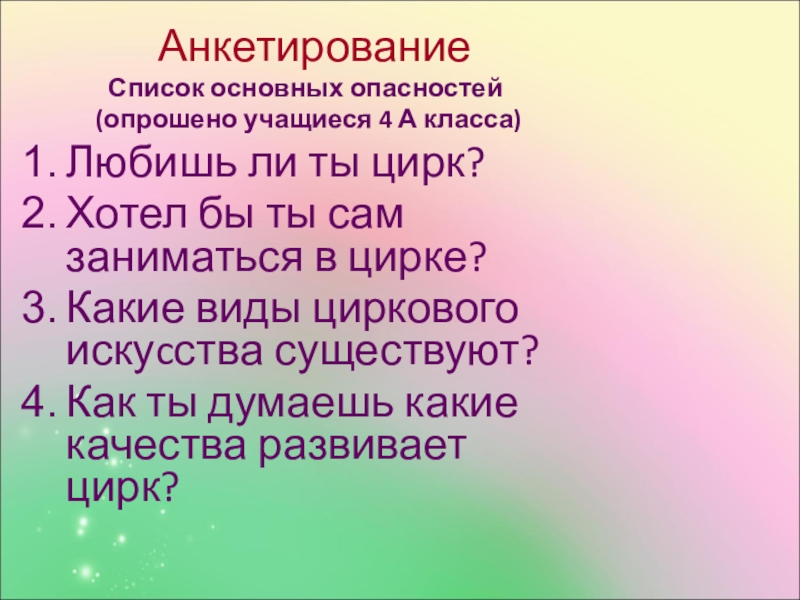 АнкетированиеСписок основных опасностей (опрошено учащиеся 4 А класса)  Любишь ли ты цирк?Хотел бы ты сам заниматься