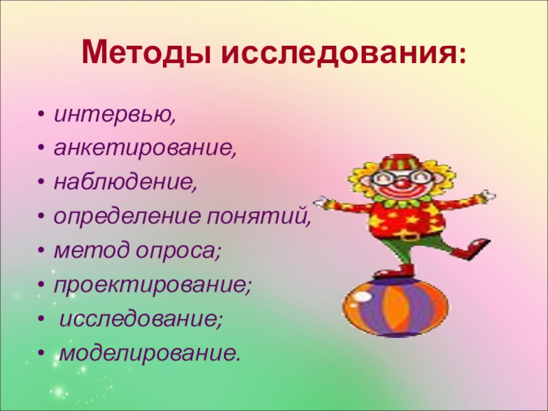 Методы исследования:интервью, анкетирование,наблюдение, определение понятий, метод опроса; проектирование; исследование; моделирование.