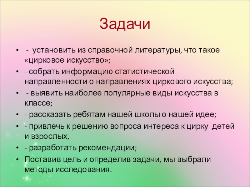 Задачи - установить из справочной литературы, что такое «цирковое искусство»;- собрать информацию статистической направленности о направлениях циркового