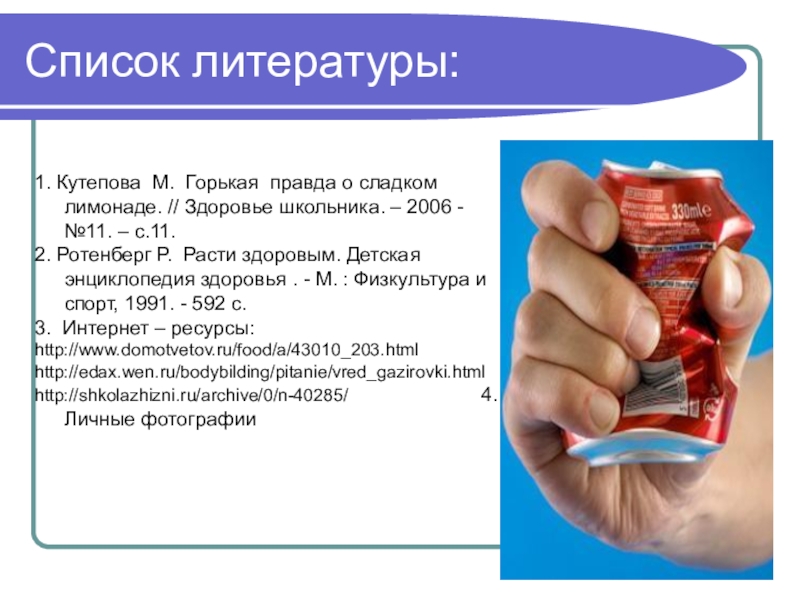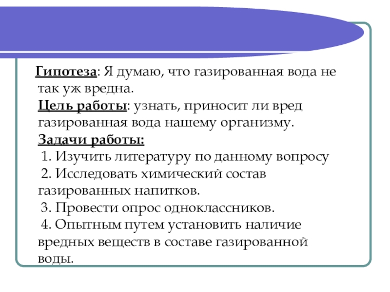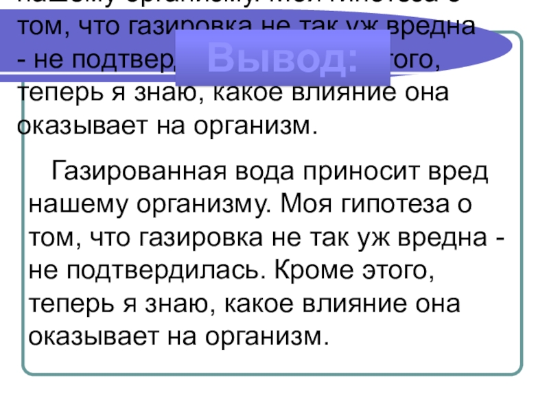 Газированная вода приносит вред нашему организму. Моя гипотеза о том, что газировка не так уж вредна - не подтвердилась. Кроме этого, теперь я знаю, какое влияние она оказывает на организм.