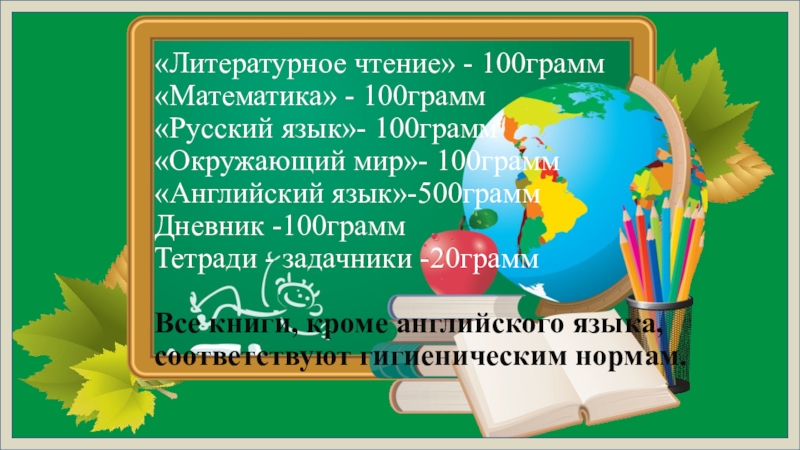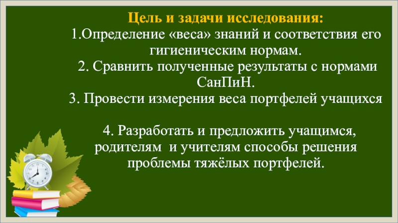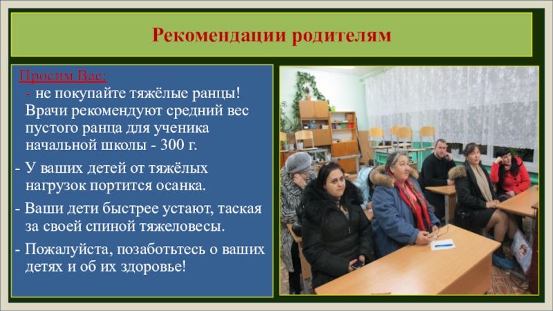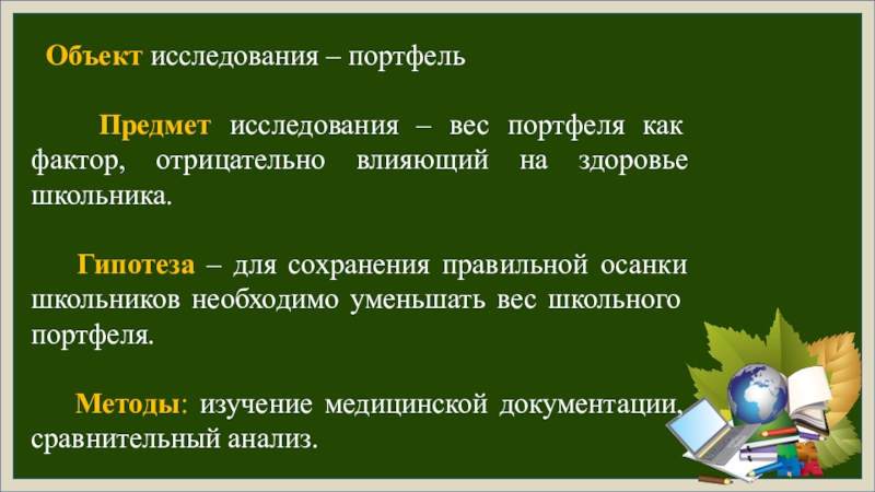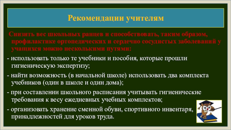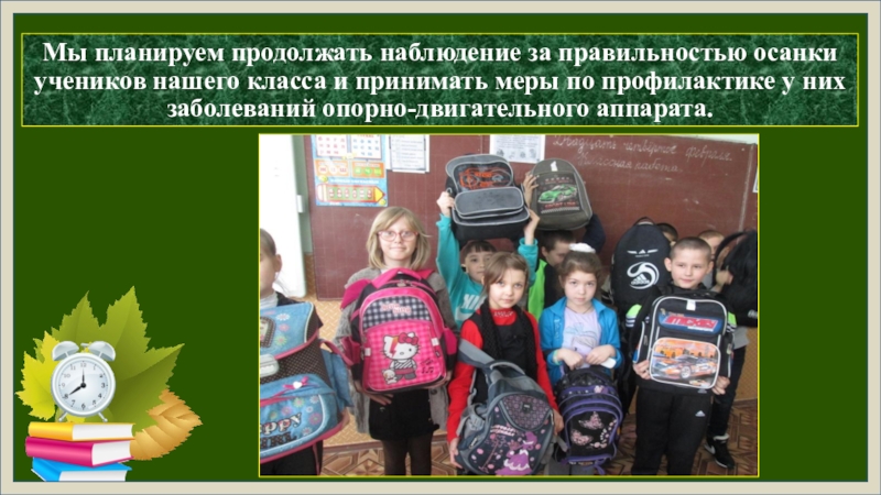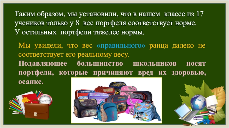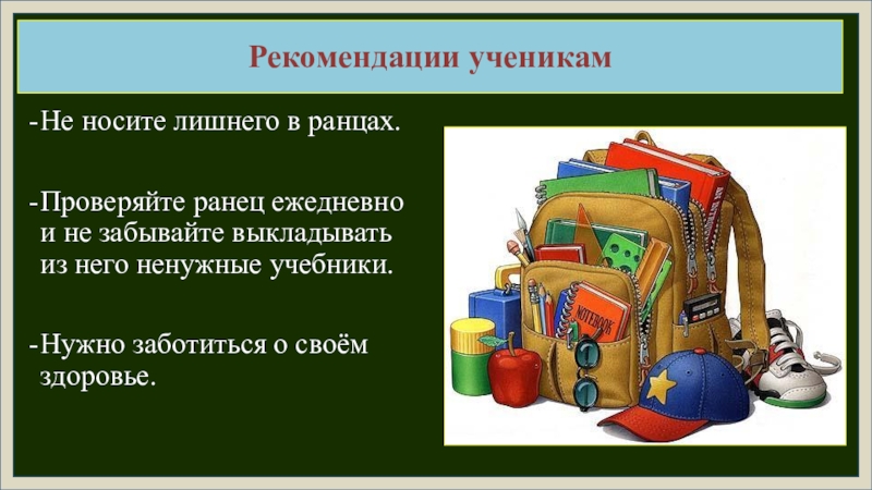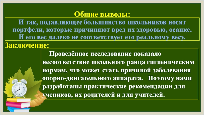 Проведённое исследование показало несоответствие школьного ранца гигиеническим нормам, что может стать причиной заболевания опорно-двигательного аппарата. Поэтому нами разработаны практические рекомендации для учеников, их родителей и для учителей.